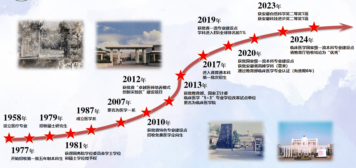 太阳成集团122ccvip是公司办学历史最为悠久、规模最大的二级公司,国内医学名家李济仁、刘贻德、孙瑞元、翟庆骏等曾在这里深耕三尺讲台。自1958年建校以来,临床医学专业在较长一段时期内为公司唯一开设的专业;1977年招收第一批临床医学专业五年制本科生,1979年招收临床医学专业硕士研究生;1987年根据公司发展需要成立医学系;2007年更名为医学一系;2013年更名为太阳成集团122ccvip,设有临床医学和康复治疗学两个专业。2019年临床医学进入ESI全球前1%学科,且排名逐年稳步提升;获批国家级一流本科专业建设点、安徽省高峰学科、安徽省一流专业、安徽省特色专业等。现有国家级住院医师规范化培训基地、国家级全科医生培养基地、安徽省住院医师规范化培训骨干团队培训基地、安徽省全科团队培训基地、省级示范实验实训中心。