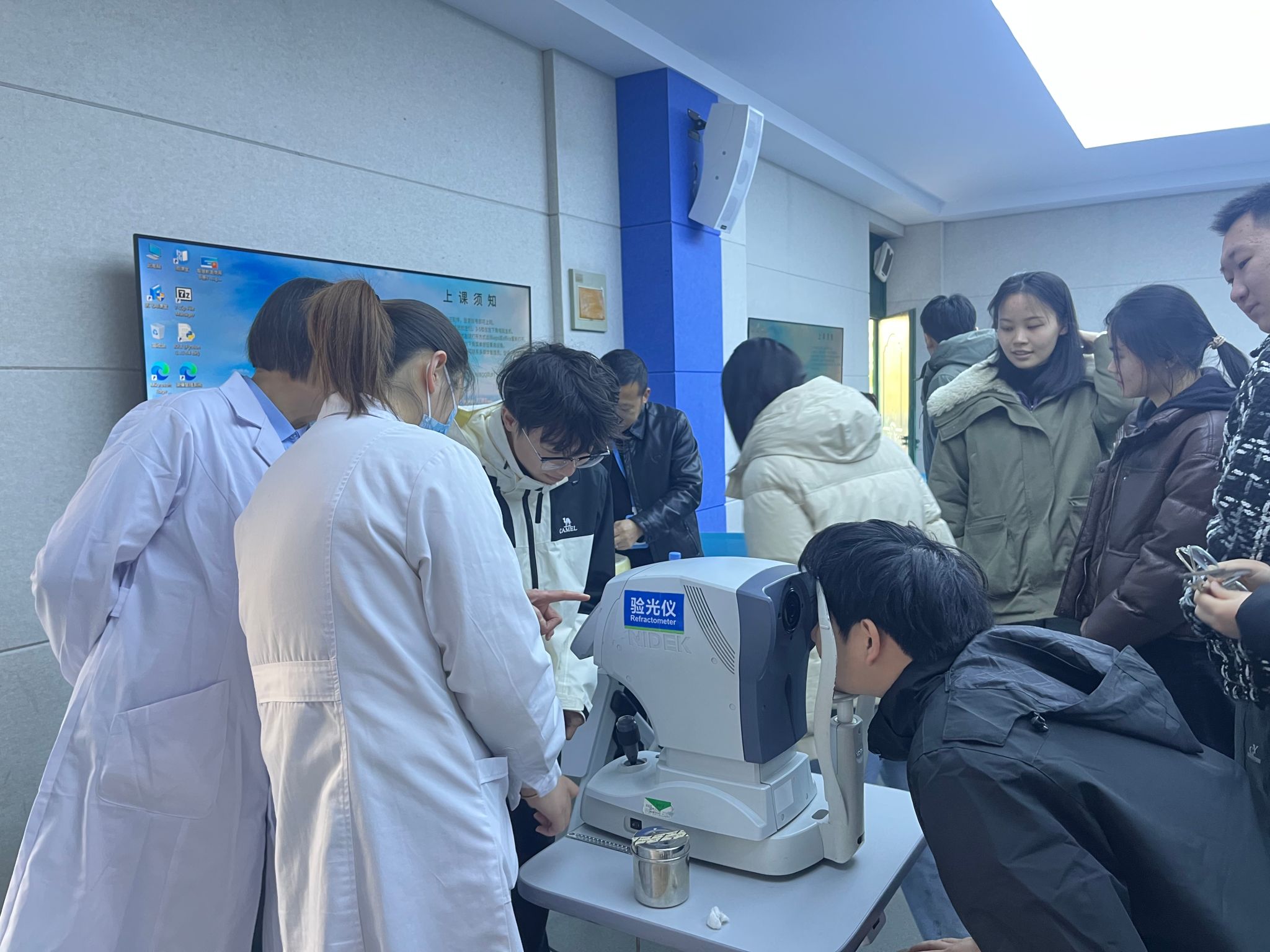 讲座中,昭美眼科医院戴巧云主任通过“PPT+视频”的方式,用通俗易懂的语言、风趣幽默的比喻,为同学们讲解了常见的眼科疾病,如过敏性结膜炎、干眼症、近视眼等眼病的临床表现、病因及治疗。讲座中采取有奖问答的形式,通过互动让同学们对常见眼科疾病知识有了更深的认知,同时也激发了同学们的学习热情。讲座结束后进行了仪器体验和实操,同学们在医务人员的指导下认真仔细地互相进行眼部检查,并相互解读检查结果。