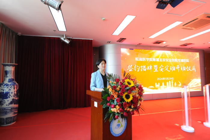 姚应水代表公司致辞。他向北京安定医院芜湖医院表示热烈祝贺,简要介绍了公司基本情况,回顾了公司与医院的合作历程,总结了双方合作主要成效。他表示,公司将充分发挥人才培养、科学研究、人力资源等优势,在医疗卫生、人才培养、科学研究等方面开展深层次、多维度的合作与交流,支持和推动医院实现高质量发展;同时,他指出“安定班”是公司探索“医学+X”多学科创新人才培养和强化专业内涵特色化发展的一项重要举措,希望医院充分发挥在精神医学和心理卫生方面优质团队队伍和教学资源优势,共同办好“安定班”,把“安定班”打造成微专业改革的示范,为健康安徽和安徽医学教育创新发展作出新的更大贡献。