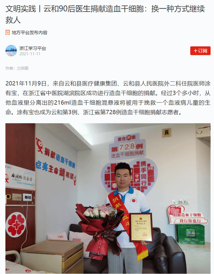 为了保障顺利捐献,在HLA高分辨配型成功后,涂有宝坚持锻炼身体、清淡饮食,调整身体机能,11月4日入住浙江省中医院,注射五天动员剂(粒细胞集落刺激因子)后,于11月9日上午完成长达三个多小时的采集,成功捐献造血干细胞216ml。采集到的造血干细胞仿佛承载着生命希望的“种子”,将为远方的患者送去希望。涂有宝也成为云和第三例、浙江省第728例造血干细胞捐献志愿者,同时也是公司第三例、太阳成集团122ccvip第二例造血干细胞捐献志愿者。