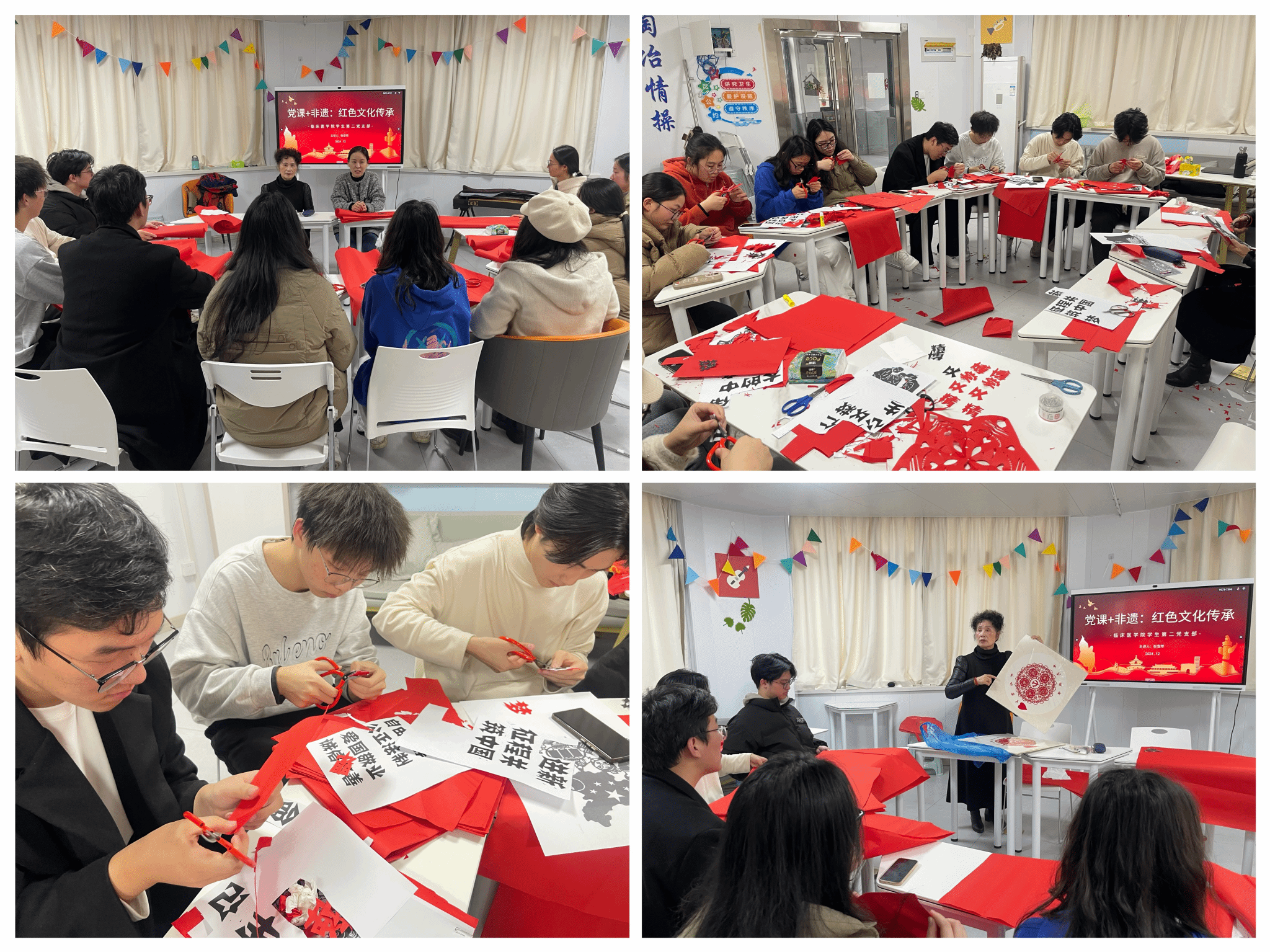 为弘扬中华优秀传统文化,坚定文化自信,赓续精神力量,12月3日,太阳成集团122ccvip员工第二党支部在“一站式”员工社区组织开展红色非遗剪纸艺术特色党课。