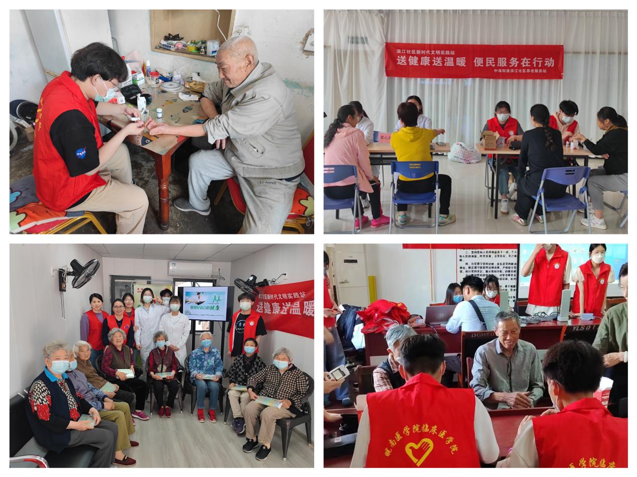5月12日和14日,党支部组织入党积极分子分别前往滨江社区党群服务中心和碧桂园社区党群服务中心活动室举行健康义诊、中老年人健康管理讲座等活动。活动中,志愿者们耐心与老人们沟通交流,了解老人自身的身体状况、既往史和用药情况等,为他们提供测血糖和测血压等服务,并针对中老年人群常见的慢性疾病开展健康讲座。同时,志愿者们为行动不便的老人提供上门义诊服务,获得了社区工作人员及居民们的一致好评。