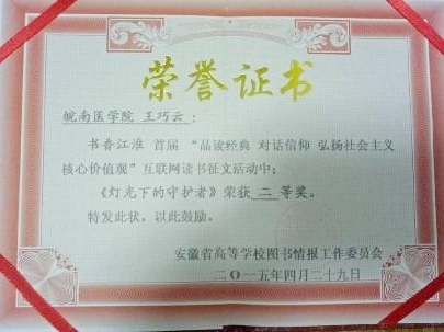 近日,2018级方舟同学的《永远的激流之曲,不老的青春之歌——巴金长篇小说< 家>读后感》荣获第六届“书香江淮”互联网读书征文活动二等奖,这是员工第二党支部第三次在该项赛事中获奖。六年来,支部注重引导广大学子利用业余时间多读书、读好书,让阅读走进老员工的生活,让经典著作引领员工理想信念、树立信仰。广泛动员师生积极参加“读书月”、“书香江淮”互联网阅读等活动。2013级临床医学专业王巧云同学荣获首届、第二届“书香江淮”互联网读书征文活动二等奖。