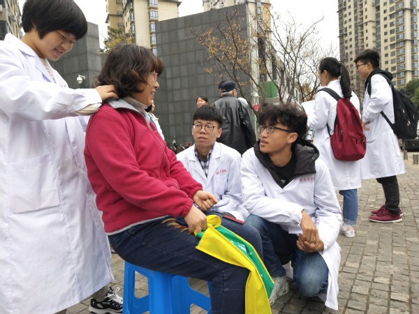 17日上午,41名志愿者来到南街社区进行健康志愿服务。志愿者们或是为老年人测量血压,提醒高血压病人冬季用药注意事项;或是向来往居民分发健康知识资料,普及冬季常见流行病预防措施;还有的志愿者开展按摩保健和十式手部健康操的现场教学,向社区居民传达健康理念。志愿者们各司其职,分工明确,各项活动有条不紊。健康志愿服务受到当地居民的关注,居民们纷纷为冬日里忙碌的同学们送来问候和关心,还有一位老奶奶送来热腾腾的生煎包,让同学们感动不已,小小的社区充满了温暖和温馨。
