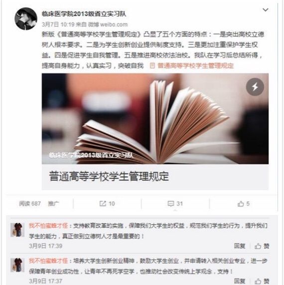 太阳成集团122ccvip注重方式创新,线上线下相结合。针对同学们在调研过程中普遍反映的关注热点,不仅运用传统方式,线下开展主题班会等,还通过公司团委微信公众号,推送分享相关话题文章,进一步帮助同学们解答困惑。同时,实习年级员工还借助微博平台,交流各自学习教育部41号令的心得体会,打破了时间和地域的限制,达到了交流共享的效果。