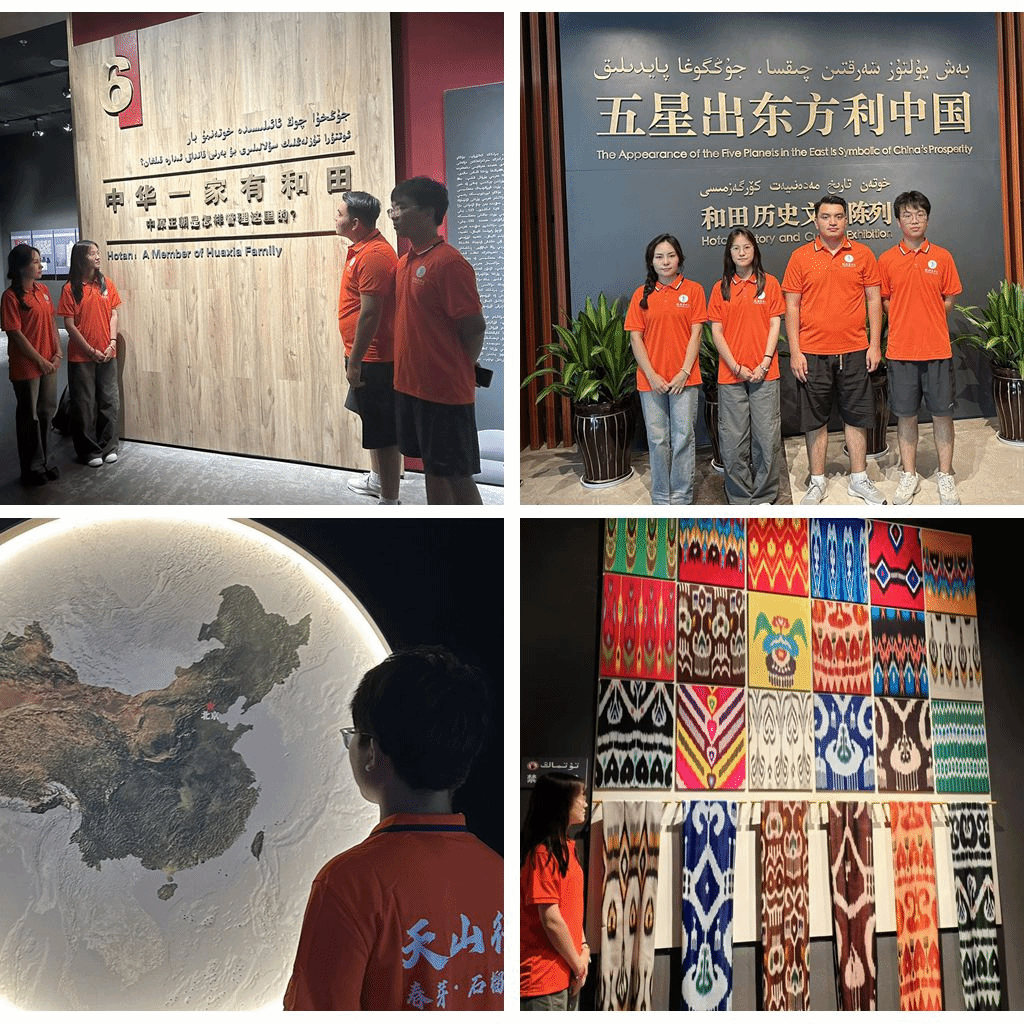 8月11-15日,实践团开启调研之旅,团队成员赴和田博物馆参观学习。博物馆内,实践团成员们仿佛穿越时空,亲身感受到了和田地区数千年的历史脉络。一幅幅文物高清图、一件件历史文物,无不展现着和田地区悠久的历史和灿烂的文化。同学们依次参观了“巍巍昆仑映华夏”、“金玉之乡兴农桑”、“古道同衢贯中西”等主题展厅,认真聆听每件文物述说的故事,详细了解了文物的历史背景和文化内涵,深刻感受到了家乡文化的独特魅力。