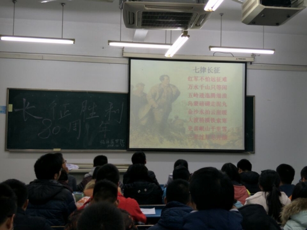 赏影片品诗词,重温峥嵘岁月 大家同坐一堂,共同观看了经典影片《长征》,片中红军长征路上充满了各种各样的艰难险阻,既有荒芜人烟的草地,也有一眼无边的雪山,但无论面临什么困难,我党和红军都凭借强大的信念和意志克服过来了,同敌对势力英勇奋战,突破重围,并取得了最终的顺利。品经典诗词《七律·长征》,“红军不怕远征难,万水千山只等闲;五岭逶迤腾细浪,乌蒙磅礴走泥丸......”谱写出了中国革命的壮烈史诗, 展现了中国共产党人的万般豪情壮志。影片的精彩演绎和诗词的壮志豪情让大家由衷的对红军产生钦佩之情,体悟到现在的幸福生活是多么的来之不易,明白当今的社会发展、国家昌盛都是由一代代中国共产党人付出巨大努力和牺牲换来的结果。