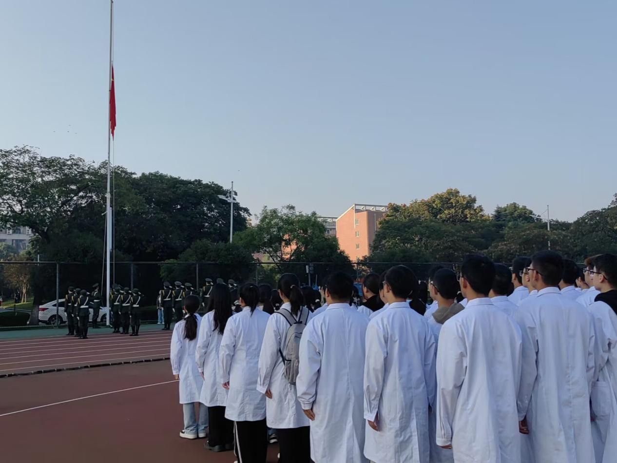 年级辅导员苏曹骢带领全体师生面向飘扬的国旗齐声唱响《歌唱祖国》,用嘹亮的歌声传递着皖医人对祖国的深情祝愿。