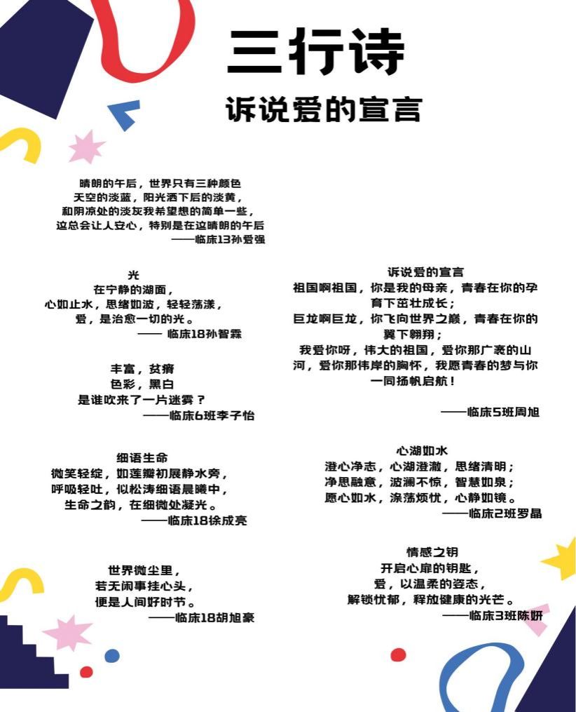 为培养员工“关爱自己 积极成长”的品质,年级推出“三行情诗 诉说宣言”为主题的征集活动,共62位同学参加。活动期间,同学们热情高涨,真情流露,尽情发挥自己的文采。在亦诗亦信的三行文字中,同学们浓缩着自己对亲情、爱情及友情最真挚的情感,向父母、朋友等诉说着生活中的点滴美好,表达出自己心中的最强音。