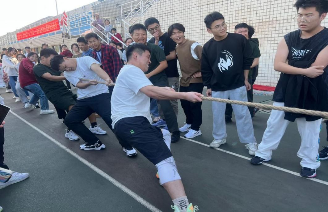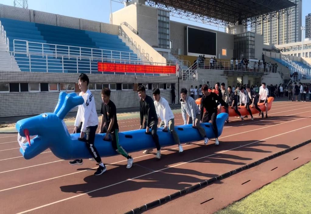 本次比赛共包含6个趣味项目,包括拔河、旱地龙舟、筷子夹乒乓球、铁人四项、抢板凳、踩气球,总计参加活动人数近300人。拔河项目中,同学们同心并力,喊着响亮的口号,彰显班级凝聚力;旱地龙舟项目中,同学们齐心协力,踏着统一的脚步,冲向赛道终点;抢板凳项目中,同学们全神贯注,伴着欢快的音乐,集中精力蓄势待发;踩气球项目中,同学们互相联盟,保护着同伴的气球,收获珍贵的友谊;铁人四项中,同学们接过同伴手中的接力棒,使出浑身解数奔向终点;夹乒乓球项目中,考验了同学们的手脚协调能力和队员之间默契配合的程度。比赛期间,每一位同学都拼尽全力展现各自风采,引得喝彩声阵阵,掌声、笑声、加油声此起彼伏,整个操场都洋溢着轻松愉悦的气氛。