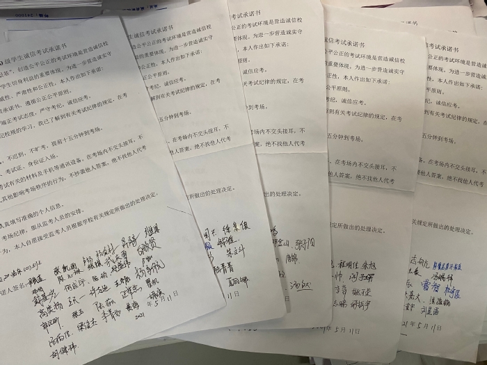 期末考试前,2020级三位辅导员老师分大班召开诚信考试主题班会、组织员工签署诚信考试承诺书,强调考试纪律和要求,要求全体员工每场考试前带齐相关证件,提前15分钟进考场,听从监考老师安排和要求,考试期间要守住诚信“底线”。同时,举办“助学筑梦 诚信成人”主题资助演讲比赛,引导员工树立诚信为本、操守为重、守信光荣、失信可耻的信用意识和道德观念,促进全面成长成才。考试期间,采取公司领导+辅导员双重巡考机制,督查各班级的考风,处理应急事件。