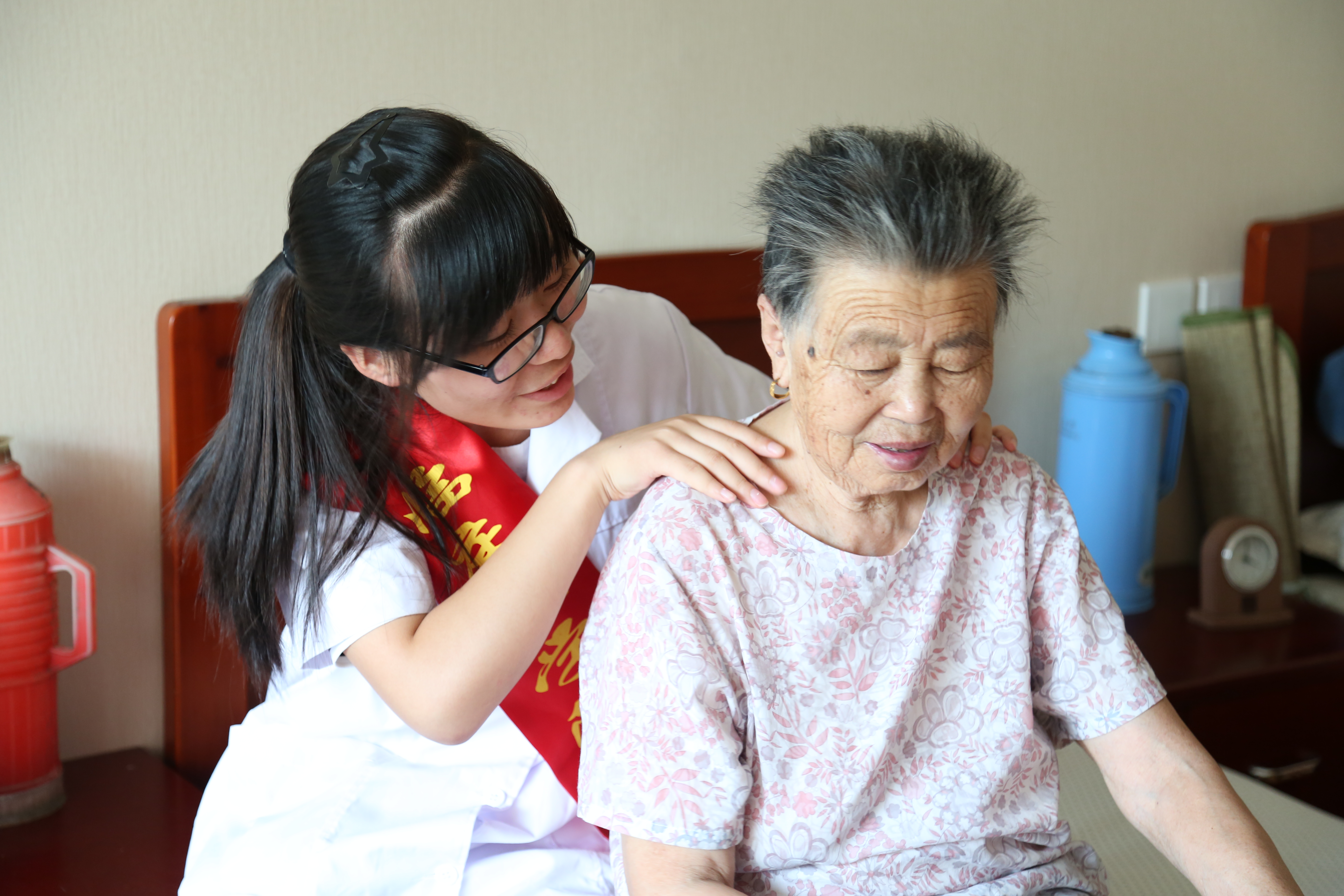志愿者为老人捏背谈心