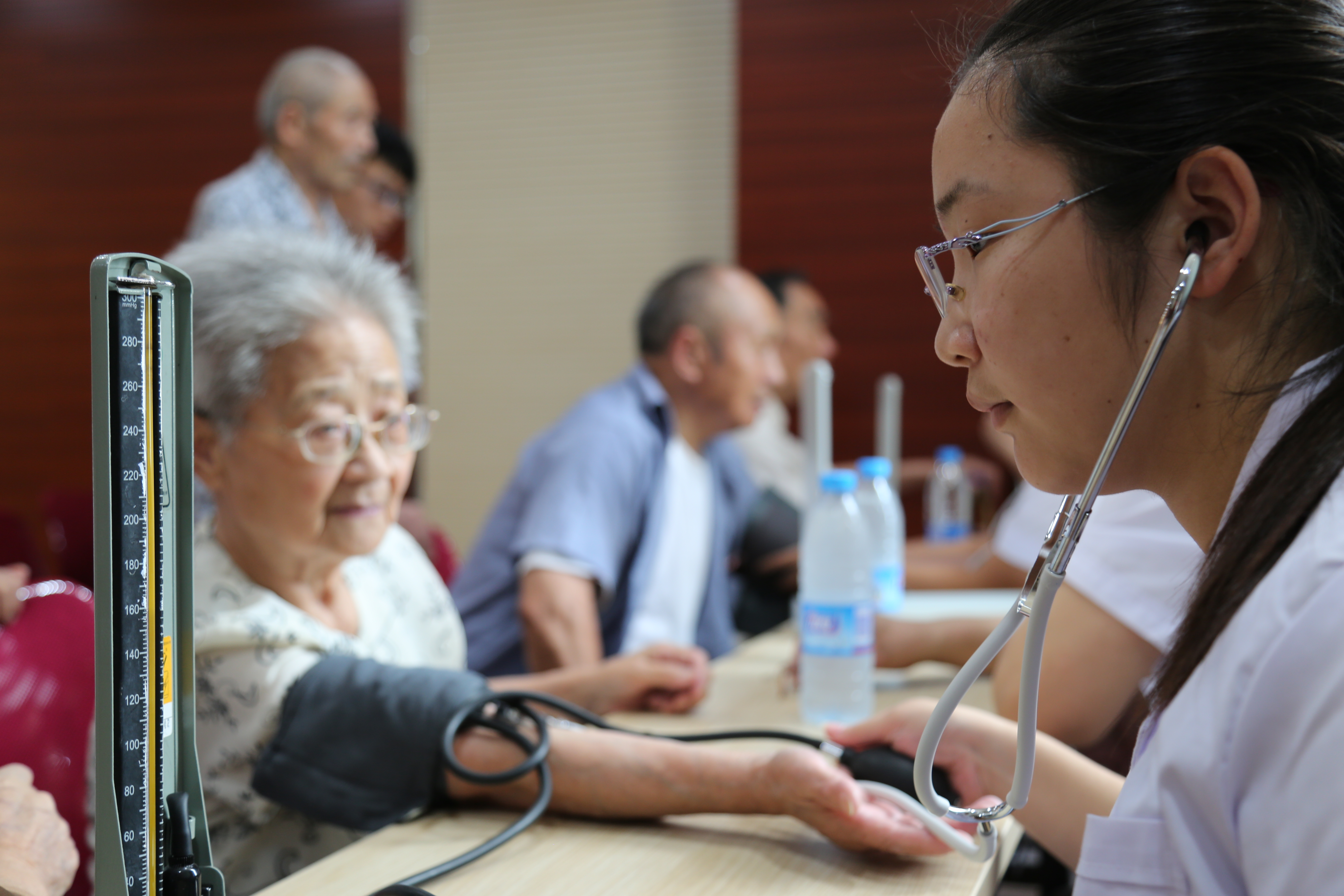 志愿者为老人测量血压