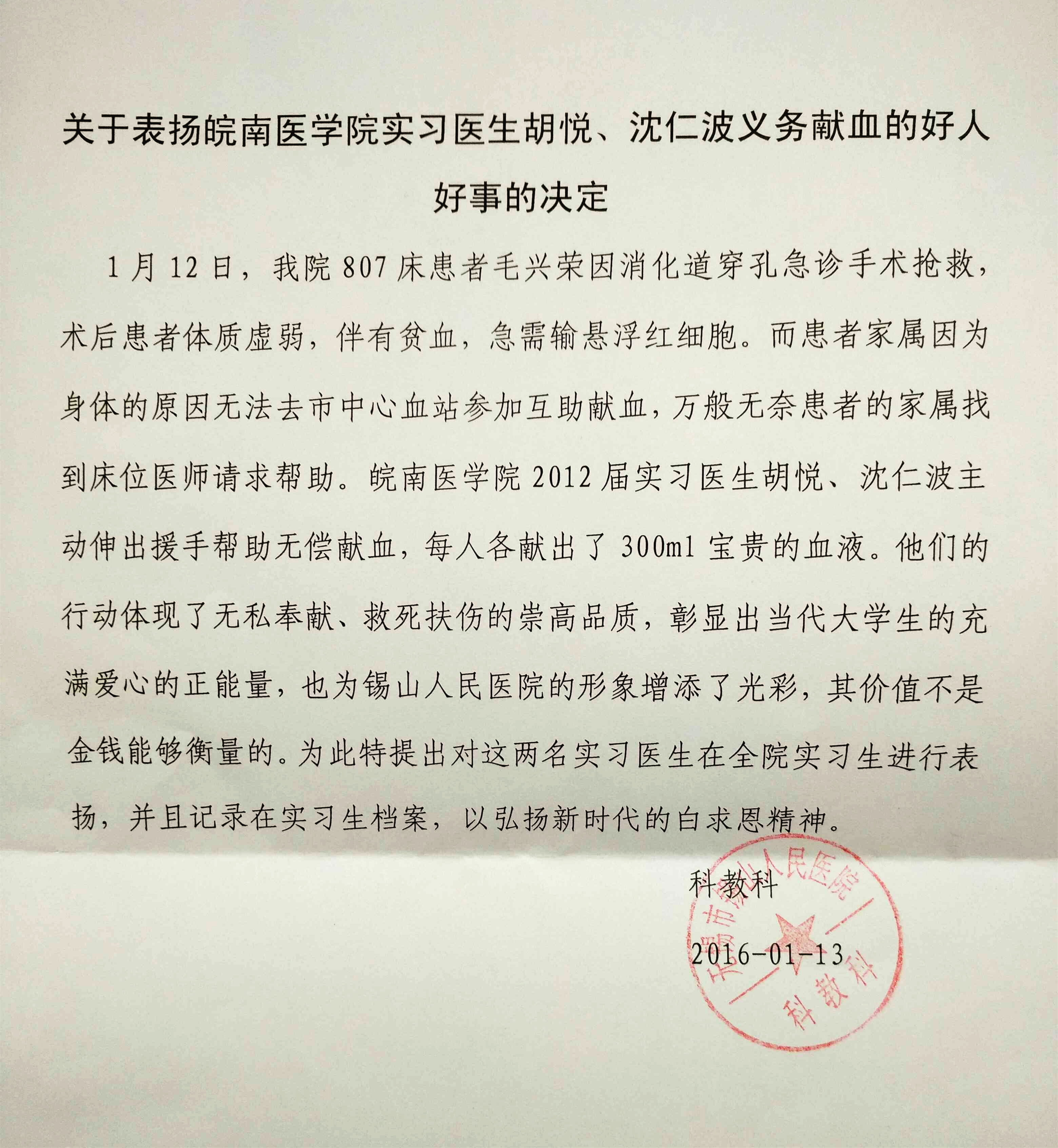 1月13日,太阳成集团122ccvip收到来自无锡市锡山人民医院科教科“关于表扬太阳成集团122ccvip实习生胡悦、沈仁波义务献血的好人好事的决定”,院方在“决定”中提到:“太阳成集团122ccvip2012级实习医生胡悦、沈仁波的行动体现了无私奉献、救死扶伤的崇高品质,彰显出当代老员工充满爱心的正能量,也为锡山人民医院的形象增添了光彩,其价值不是金钱能够衡量的。为此特提出对这两名实习生在全院实习生中进行表扬,并且记录在实习生档案,以弘扬新时代的白求恩精神。”