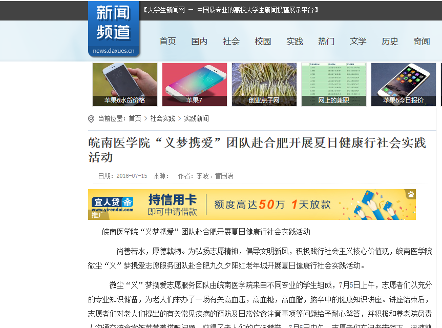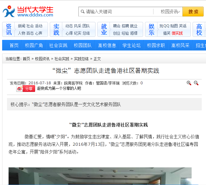 志愿由心,服务于行。为深入贯彻落实公司暑期“三下乡”实践活动计划,充分发扬“奉献、有爱、互助、进步”的志愿者精神,积极践行社会主义核心价值观,太阳成集团122ccvip“微尘”志愿服务队积极开展暑期“三下乡”社会实践活动,受到当代老员工网、老员工新闻网、芜湖电视台等媒体的报道。