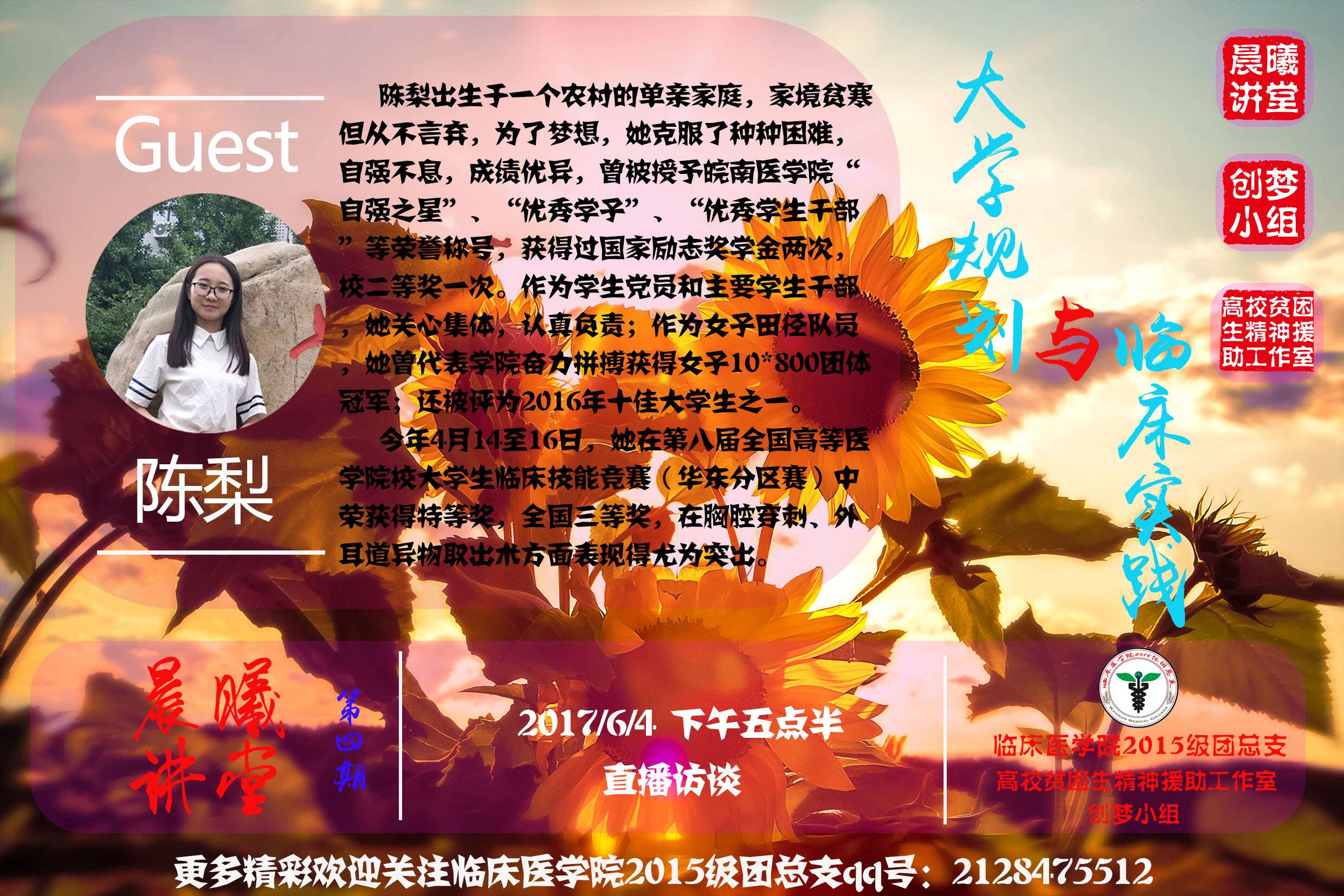 6月4日晚,太阳成集团122ccvip在3207教室举办了第四期“晨曦讲堂”——大学规划与临床实践。此次活动主讲嘉宾为校“十佳大学生”第八届全国高等医公司校老员工临床技能竞赛总决赛三等奖、获奖选手2012级陈梨同学,太阳成集团122ccvip“创梦”小组成员参与了现场交流,逾八百人次观看了线上直播。