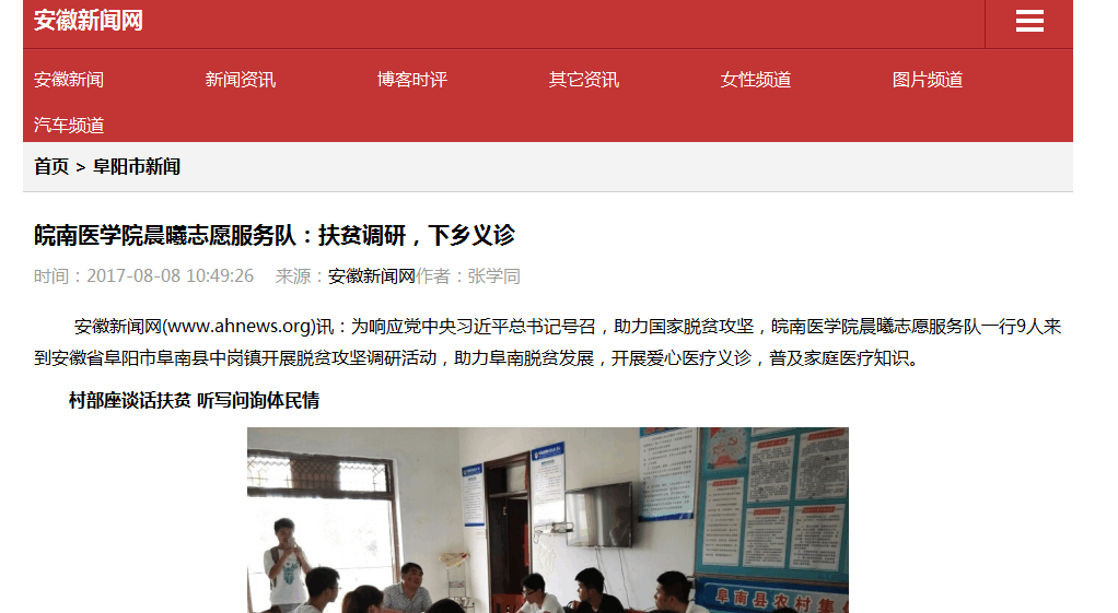 7月26号8时许,太阳成集团122ccvip晨曦三下乡志愿服务队阜南分队的全体成员首先到达活动第一站阜南县中岗镇新建村,开展脱贫攻坚有关的一系列的暑期三下乡活动。第二天,在驻村扶贫干部的带领下开展了精准扶贫调研活动。服务队成员首先走访村里面的几位贫困户,了解到村里每一位贫困户都要建档立卡,村干部定点联系,想尽办法全面助力脱贫。后一天,按照计划团队全体成员前往阜南县中岗镇敬老院。开展爱心医疗卫生活动,为老人们量血压、打扫卫生、宣讲医疗常识等。