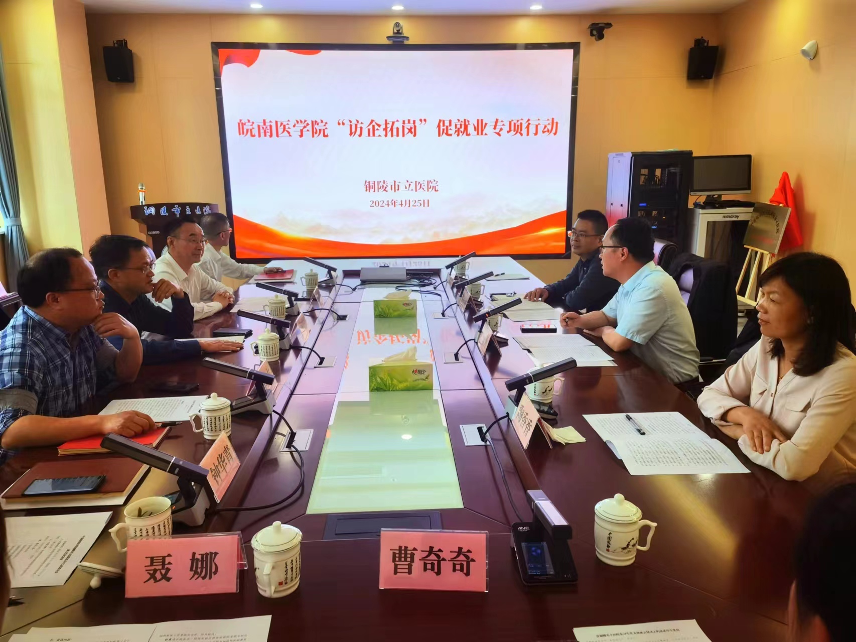 为持续推进“访企拓岗”专项行动,深化校院合作,4月25日,公司党委书记方基勇、副经理陈祥攀、党委副书记陶香香赴铜陵开展访企拓岗工作,受到皖医附属铜陵医公司党委书记何向阳,党委副书记、副经理(主持行政工作)应国平,副经理冯孝志的热情接待。