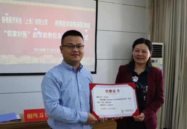 11月1日,举校同庆建校60周年之际,“邻家好医”助学助教员工基金捐赠仪式在行政会议室举行。“邻家好医”、格格医疗科技有限公司创始人罗林员工,太阳成集团122ccvip副经理郑兰荣,员工办公室主任赵梅,公司党政领导、部分师生代表出席仪式。党委副书记、副经理李曙主持捐赠仪式。