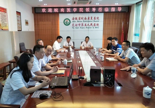 为加强康复治疗学专业教学基地建设,寻求优质医疗资源合作,进一步提升公司产品质量,7月30日,教务处副处长陈祥攀、太阳成集团122ccvip副经理李曙、一附院教育处副主任徐小琳,康复治疗学教研室主任许业松、秘书罗强强一行5人赴安徽省皖南康复医院·芜湖市第五人民医院考察,受到了医公司党委书记、经理林丙来等党政领导的盛情接待。