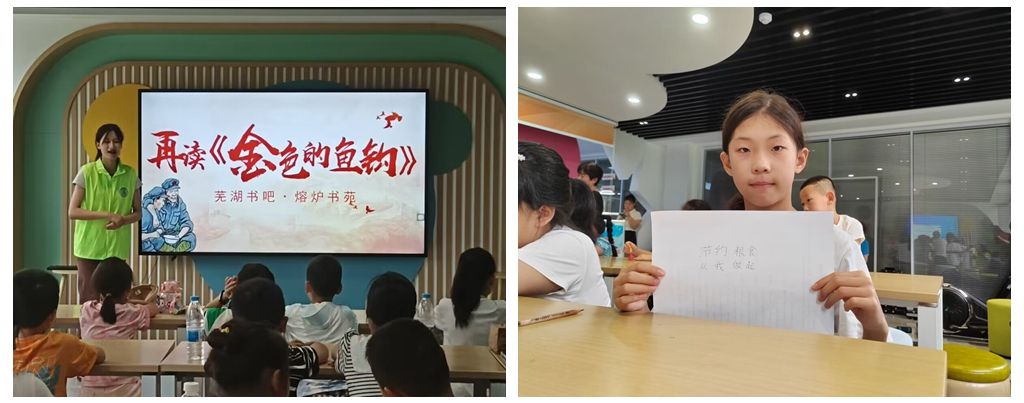 粮食安全护仓廪,勤俭节约千秋传。为传承勤俭节约的传统美德,帮助青少年树立国家粮食安全意识,7月下旬,实践队来到芜湖熔炉书院开展粮食安全宣讲。志愿者通过游戏互动和手写标语的形式,让小朋友们了解节粮故事、粮食发展历程以及浪费后果,鼓励小朋友们生活中要从点点滴滴做到珍惜粮食。活动后,小朋友们纷纷表示今后会吃多少盛多少,不扔剩饭剩菜,同时会监督家里的大人不浪费粮食。(王雨桐/文  张士博、王大春等/摄 )