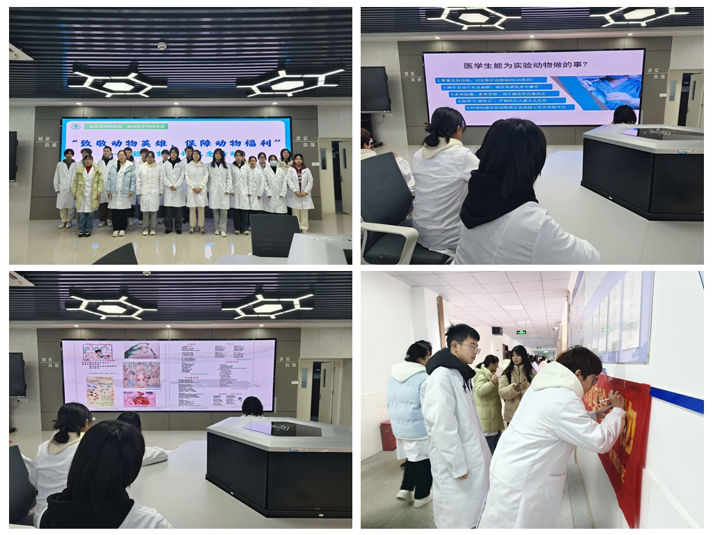 早上九点,同学们来到皖医接受站缅怀室和人体标本馆,大家集体敬献鲜花、默哀鞠躬、表达哀思,缅怀他们为人类医学进步和生命健康事业作出的贡献和无私的大爱情怀。随后来到机能学实验中心,实验中心刘鑫老师向大家介绍了实验动物对于人类生命科学研究的贡献以及在医学实验教学过程中发挥的巨大作用,强调了善待实验动物的“3R”原则,倡导大家在平时的实验课中秉持敬重生命的意识,维护实验动物的生命尊严,并组织同学们在横幅上签名,礼敬实验动物。