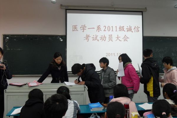 临近期末,医学一系2011级新生也面临大学以来的第一次期末考试,为进一步加强学风、考风建设,倡导诚信做人、诚信考试,医学一系2011级于11月30日中午在西教202教室举行“医学一系2011级诚信考试动员大会”, 辅导员刘韦、王平、叶长江和2011级全体班干参加会议。