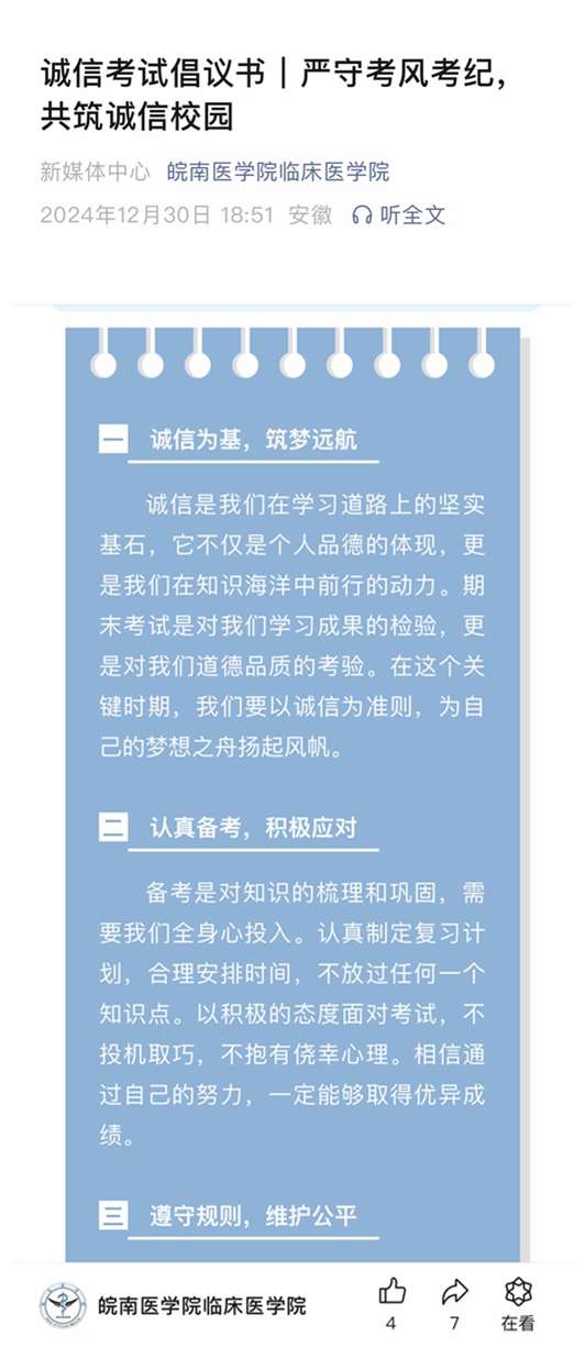推文提醒,点亮诚信之光。公司及年级通过微信公众号、辅导猫、QQ等平台,开展线上专题教育,发布诚信考试温馨提示及倡议书,帮助同学们提高思想认识,端正考试态度,营造公平、公正的期末考试氛围。