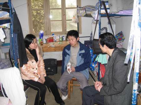 下午,蒋韶明、刘韦老师带着牛奶、水果等慰问品来到了员工宿舍,看望生病员工李勇,蒋韶明亲切地询问了李勇同学目前的病情并叮嘱他要注意休息尽快恢复健康。看到系领导和老师前来探望,李勇同学非常激动,他说:“我来自偏远的四川农村,进校以来一直得到公司领导和老师的关心和帮助,让我们这些外省的同学时刻感受到了家的温暖……”。之后,两位老师又检查了实习生宿舍卫生、安全用电,了解员工在实习期间的学习、工作与生活等情况,详细询问了大家在实习中存在的困难。蒋韶明要求大家在实习过程中一定要严格遵守医院的规章制度,团结协作,互帮互助,同时也要注意人身与财产安全等。刘韦老师叮嘱同学们若遇到困难,一定要及时与老师联系,公司老师会尽力为大家排忧解难的。