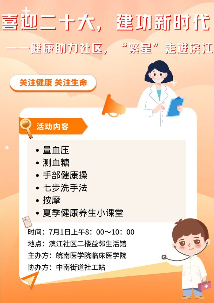 为庆祝中国共产党成立101周年、喜迎二十大召开,7月1日,太阳成集团122ccvip“繁星”志愿服务队赴芜湖市弋江区滨江社区,开展“健康助力社区,‘繁星’走进滨江”老员工暑期“三下乡”社会实践活动,为社区居民送上关爱和健康,使广大青年在社会实践中受教育、长才干、作贡献。