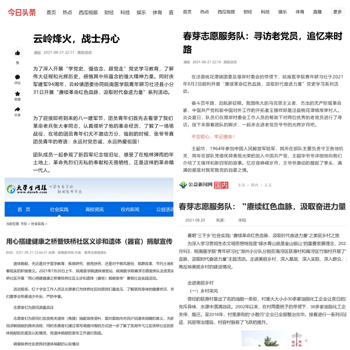 为深入学习宣传习近平新时代中国特色社会主义思想,贯彻落实习近平总书记关于青年工作的重要思想,引导广大青年员工在加强志愿服务中增强责任感和使命感,在实践中修炼自我,在奋斗中增长才干,太阳成集团122ccvip“春芽”志愿服务队在暑期积极开展社会调查、理论宣讲、志愿服务、专业参访等多种形式的社会实践活动,并受到今日头条、老员工网报、公益新闻网、芜湖民生网、云岭镇团委等多家媒体报道。
